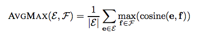We use the following expression to find words with the closest translation, given sets of images ℰ from the source word e and ℱ from the target word f, the average top-matches are used to produce a single value: