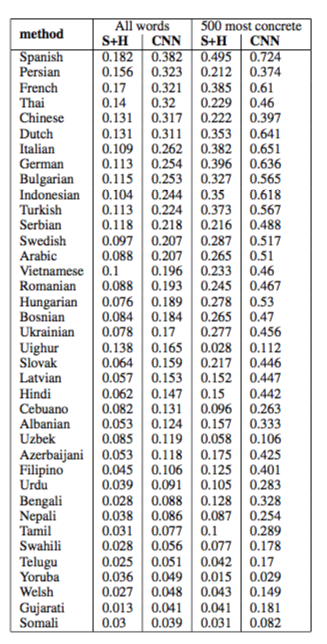 The model's ranking is evaluated using Mean Reciprocal Rank (MRR) and top-N accuracy. Unlike previous work which only translate among concrete nouns in high resource languages, we consider all words in our corpus, and amongst many low resource languages such as Uzbek and Urdu. When analyzing the results, we chose 500 most concrete words (often words that is grounded in one concept in reality, such as "car") and report the results separately. The concrete nouns are selected according the Ghent dataset.