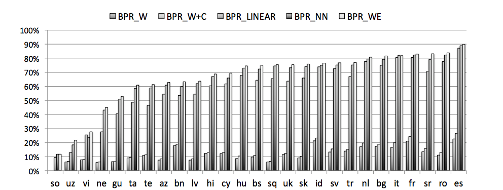 Finally, we noted that a seed lexicon size of 5k is sufficient to achieve optimal performance across languages, although it is unclear why this is. In conclusion, in this project we proposed a novel framework for combining multi-modal data from diverse sources, each of which may be sparse or noisy. The framework is based on matrix completion and use BPR to learn translations. Our method is effective across different languages, and accuracy improves as the volume of data increases. Finally, our framework can trivially incorporate additional signals.