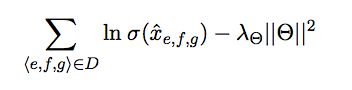 Specifically, for logistic sigmoid function σ, parameter vector Θ with values xe,f,g, and hyperparameter λΘ the objective function of BPR is to maximize the sum of log triplet score differences subject to sparsity penalty: