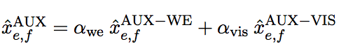 in this case θe is the visual features extracted by AlexNet, and each αi is another auxiliary feature. Note all the parameters in the expression are learned. Note although it is possible to combine xe,fMF and xe,fAUX by addition, we note that xe,fMF has high precision but low recall, and vice versa for xe,fAUX. Thus we only back-off to xe,fAUX for words that have too few associated translations.