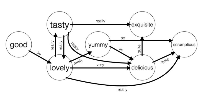 We noted that the directed graph formulation can be readily applied to N-Graph data as well, in this case the pattern “good but not great” could correspond to the tuple (good, but not great), whereby the utterance “but not” de-intensify the adjective “great”. In the interest of simplicity we invert the edge so that the triplet is actually (good, great; but not) in keeping with the convention that the source of the edge is weaker than the target under the edge label. The N-gram graph has 36,8439 edges, but only covers 178 of the adjectives we found in Paraphrase Graph.